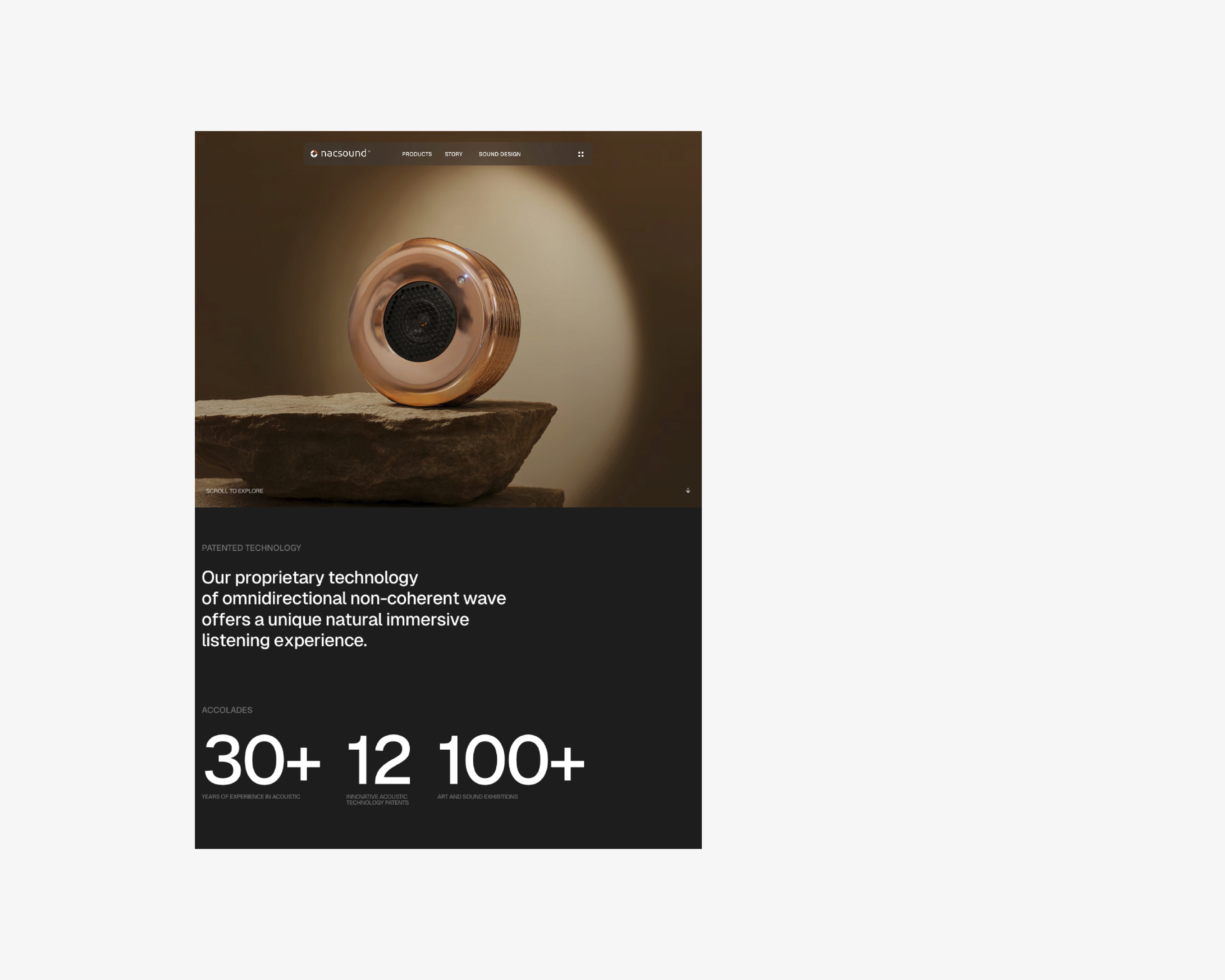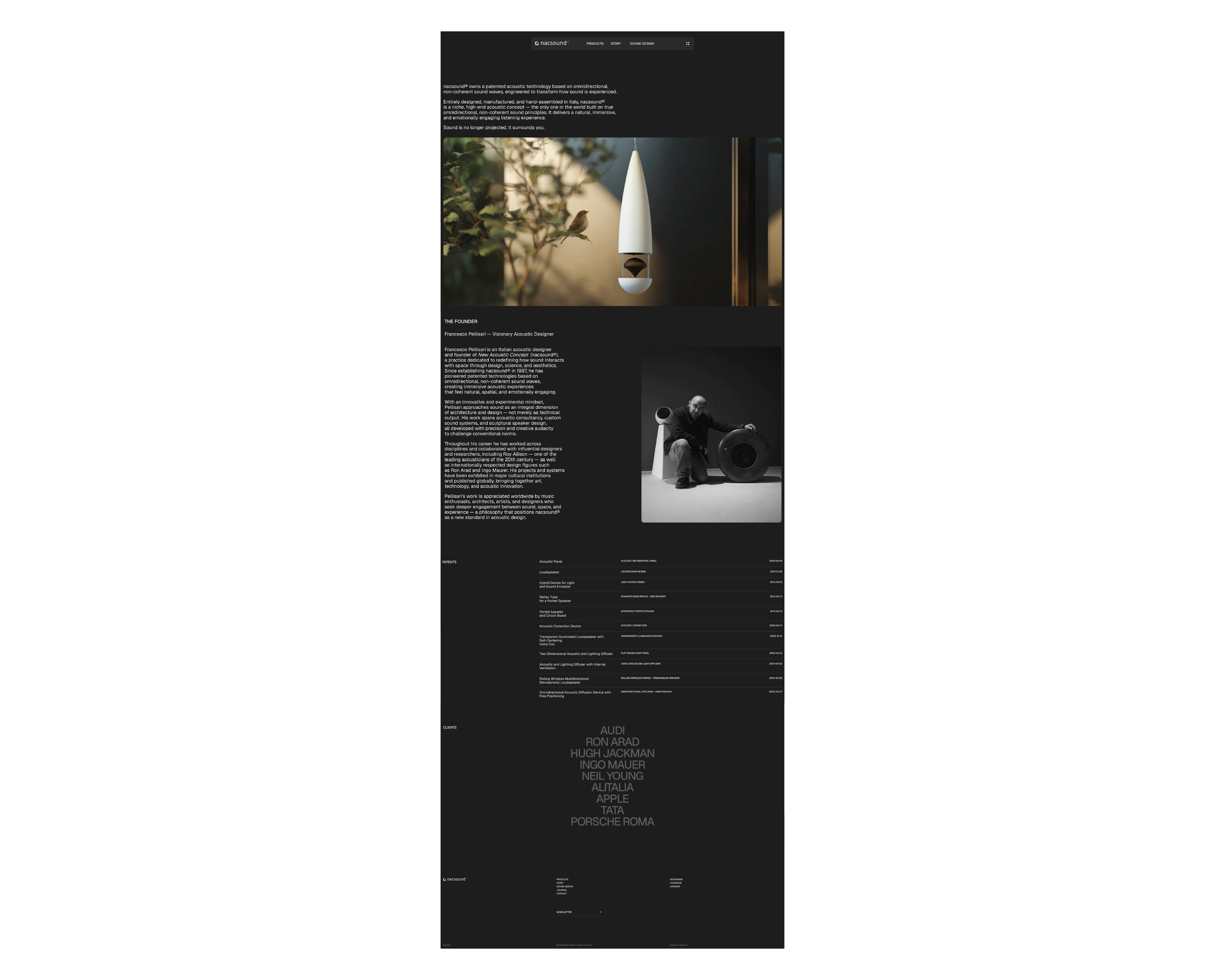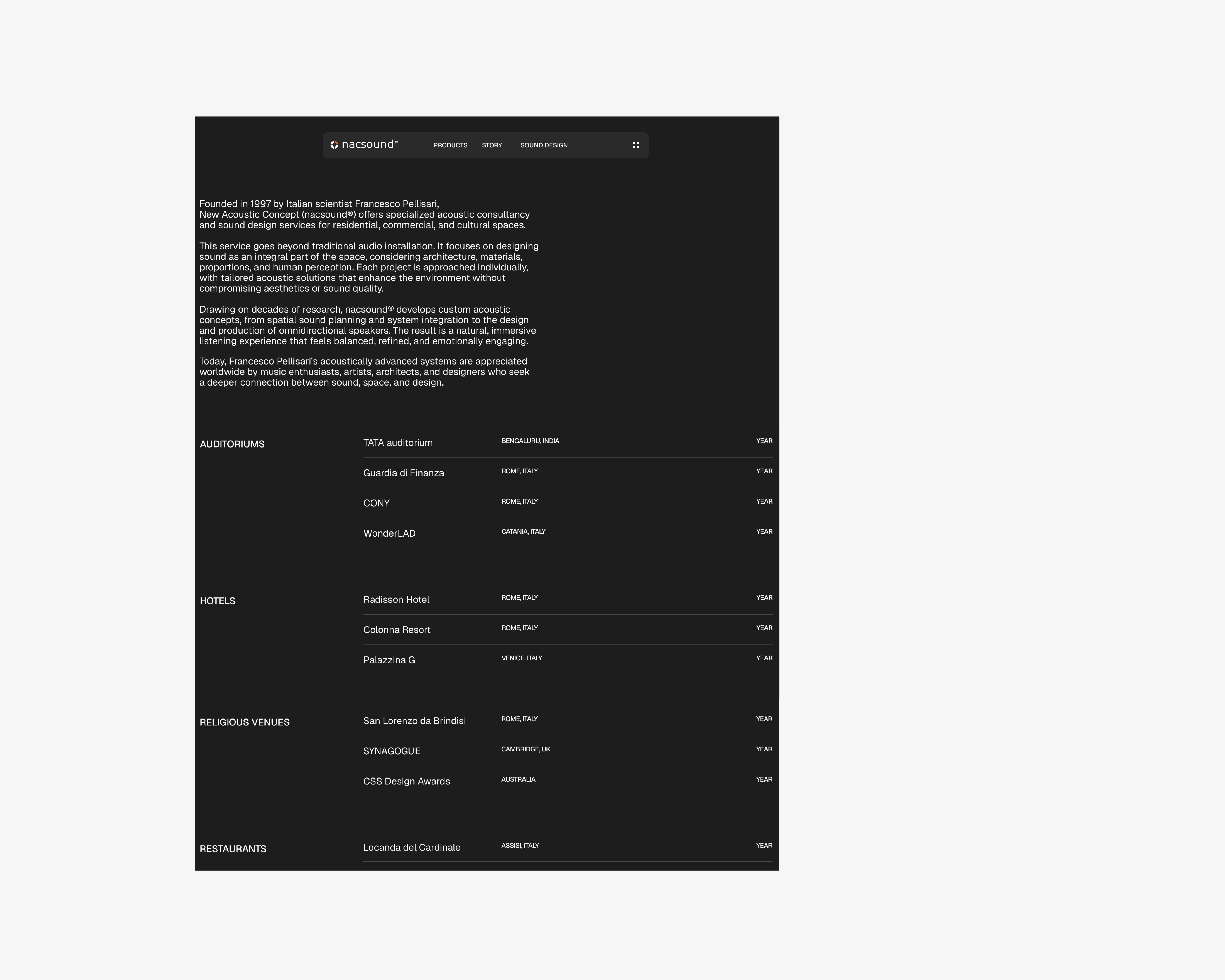 NacSound is an innovative Italian acoustic design brand developing high-end sound systems and immersive audio environments based on proprietary, patented technologies at the intersection of science, art, and design. The goal of this project was to create an elegant, contemporary website that communicates sound as an experience — not just a product.