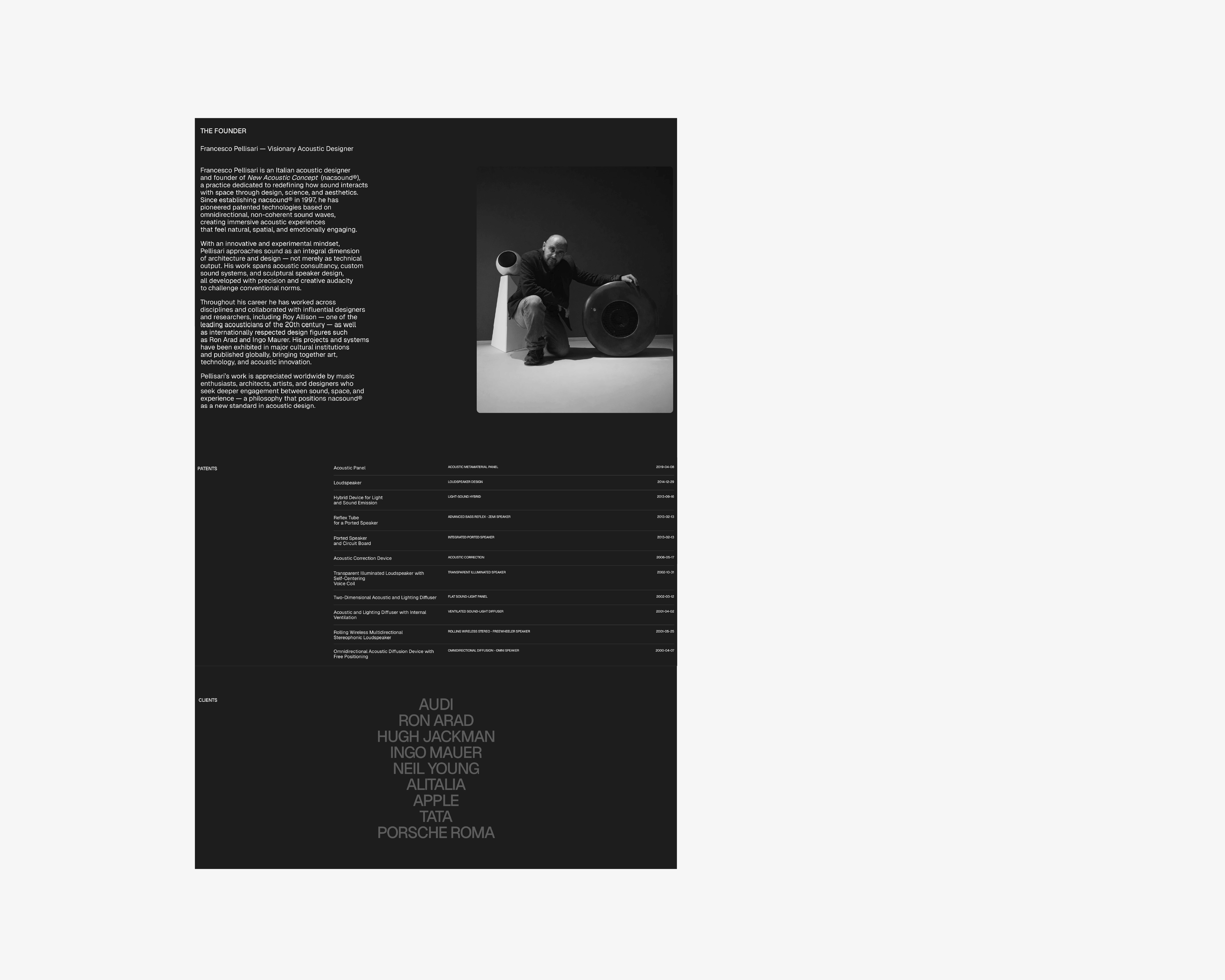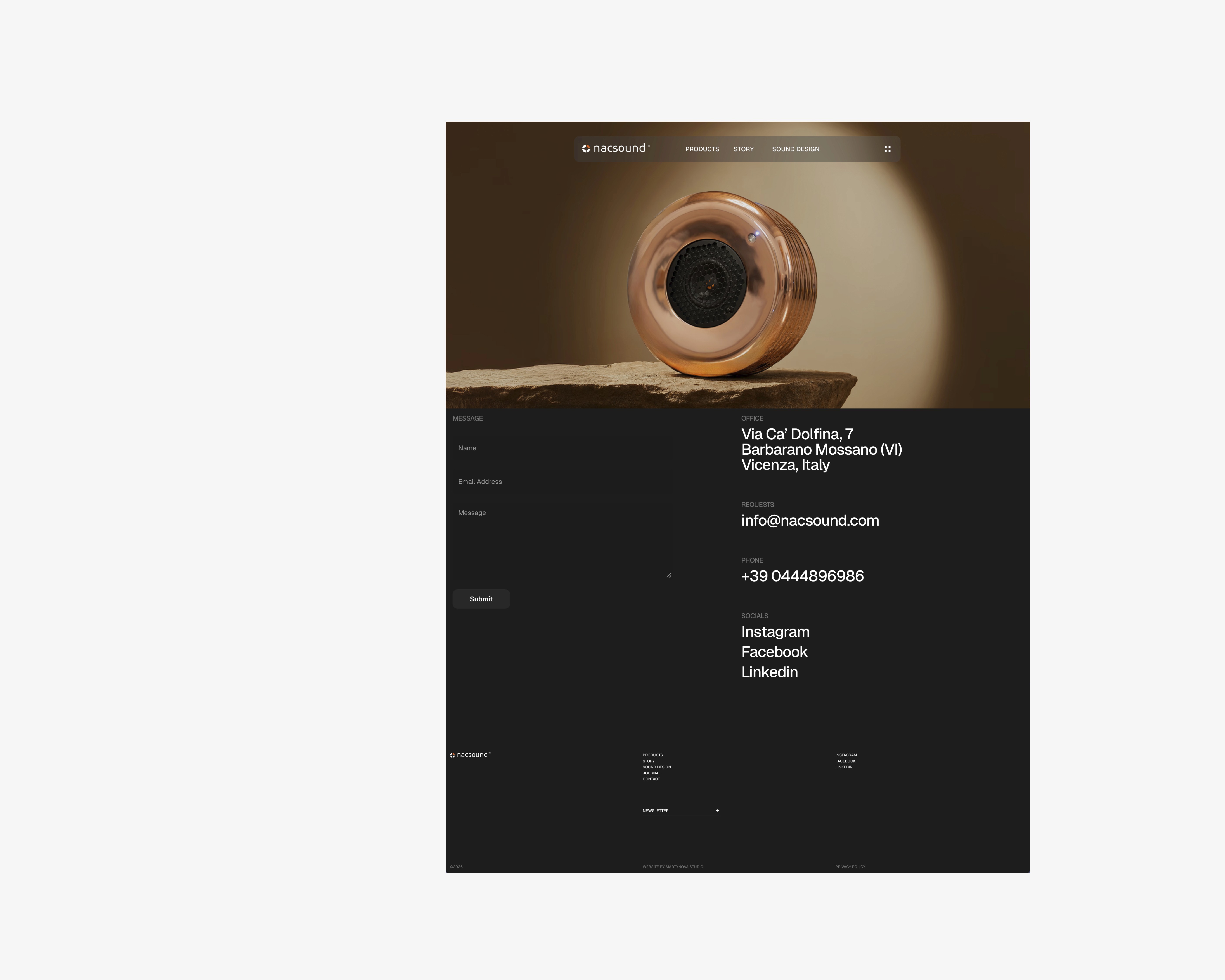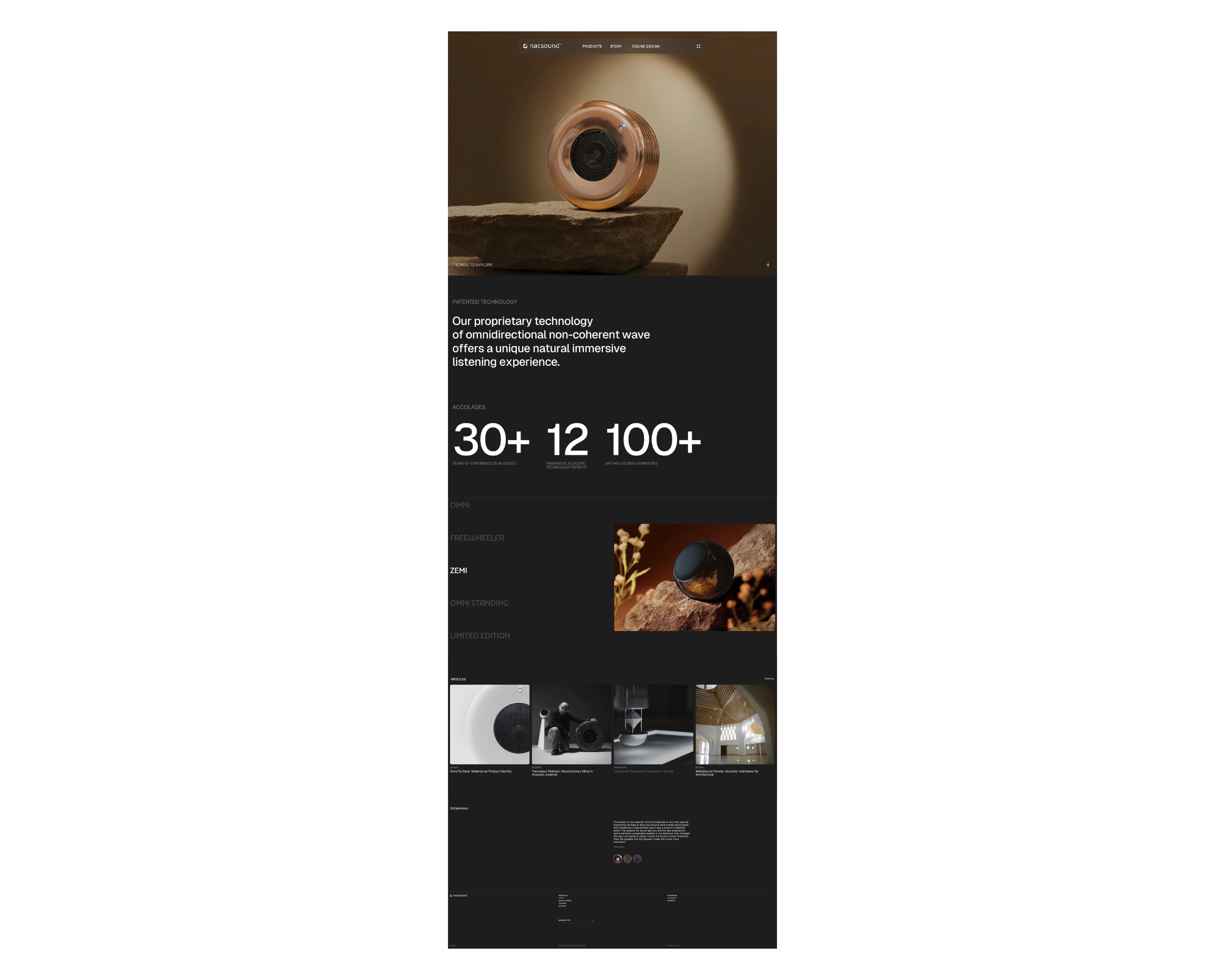 NacSound is an innovative Italian acoustic design brand developing high-end sound systems and immersive audio environments based on proprietary, patented technologies at the intersection of science, art, and design. The goal of this project was to create an elegant, contemporary website that communicates sound as an experience — not just a product.